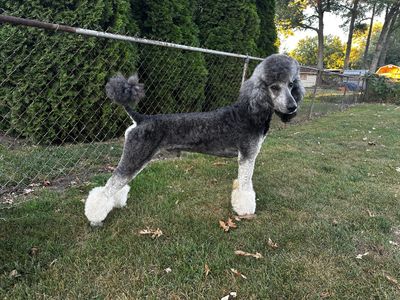 Wilson's Southern Boy South is an AKC Standard Poodle weighing 43 pounds and 21" tall. South was born 9/7/22. He has produced amazing puppies and is proven live cover. He is intently human focused and very athletic. He is co-owned with Wilson Family Companions.