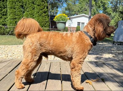 Jasper was born July 24, 2024 and is a puppy we kept from Ruby Jean's litter. He is a mini-multigen goldendoodle weighing 33 pounds and is 18" tall. Jasper is calm for a mini-golden doodle. He rarely barks. Jasper has received his CGC obedience title and is currently working in scent work classes as he has an incredible drive for work. He enjoys 2 nights of training per week at our local club and being social with the other dogs. He is co-owned with Wilson Family Companions.